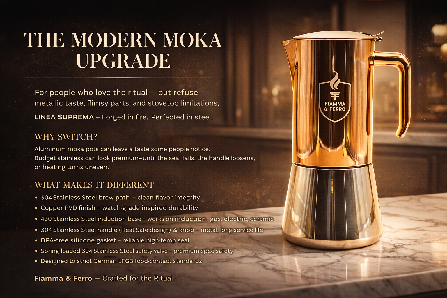 Whether on a marble countertop in Milan or a modern American kitchen, Fiamma & Ferro stands as a tribute to espresso’s origins — continuing the story that began with Moriondo’s vision and was perfected in the cafés of Italy.
